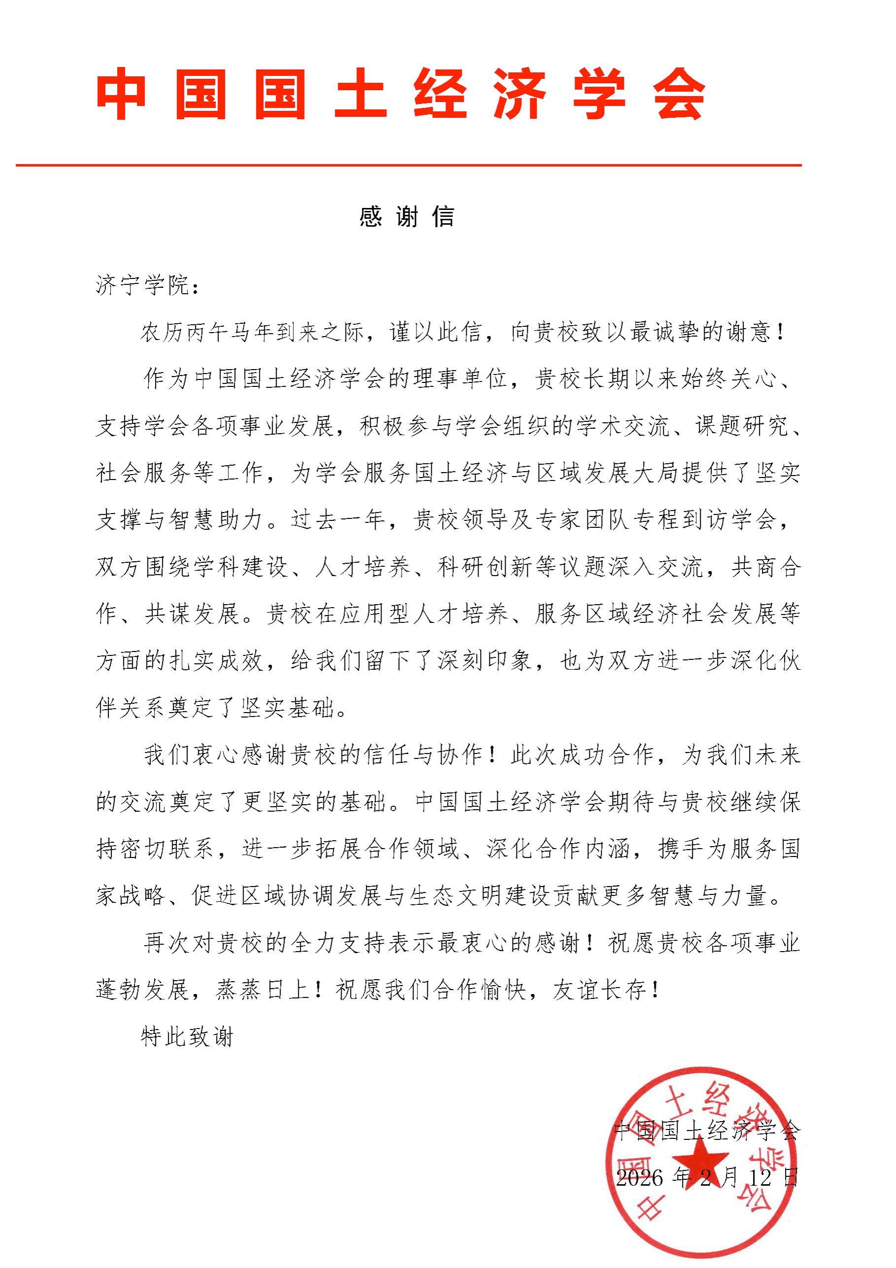 学校收到中国国土经济学会感谢信