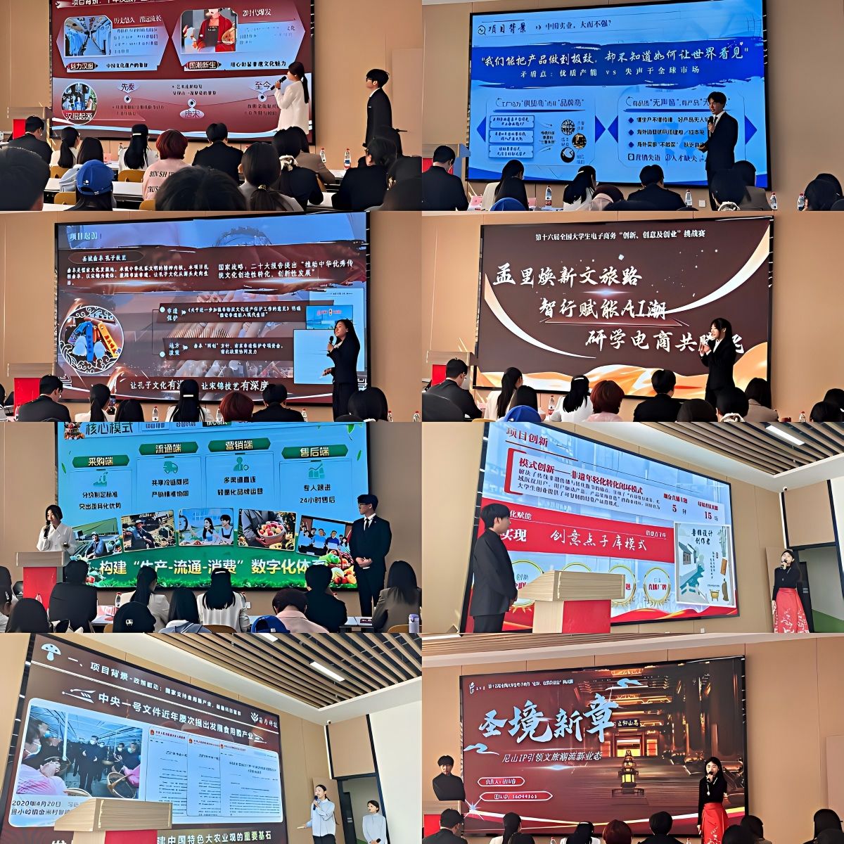 自去年10月启动以来,本届校赛吸引了来自全校各学院的2162名学生、共460支团队报名参赛。经过初赛和小组赛的激烈角逐,多支优秀团队脱颖而出。参赛项目紧扣社会热点,聚焦市场前沿,围绕项目背景、竞争优势、现有成果及未来规划进行了深入剖析,涵盖了乡村振兴、文化创意、非遗传承、社群电商、跨境电商、商务数据分析等多个领域,充分展现了学生扎实的专业素养、敏锐的市场洞察力与出色的创新能力。