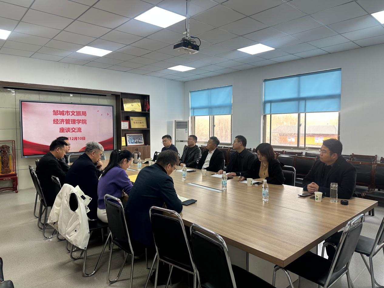 上午9时,邹城市文旅局党组书记、局长高胜一行6人到经济管理学院考察交流,经济管理学院党委书记乔东华、院长霍雨慧参加了座谈,双方就文旅融合高质量发展和毕业生实习就业开展座谈交流,达成招才引智的合作意向。