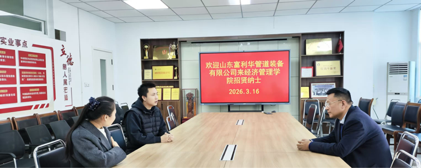 为进一步深化校企合作,拓宽毕业生就业渠道,推动实现高质量充分就业,2026年3月16日,经济管理学院开展“访企拓岗·引进来”专项交流活动,邀请山东富利华管道装备有限公司济宁项目部经理么金辉来访座谈。经济管理学院党委副书记岳现超,毕业班辅导员徐纪元、袁铭参加座谈。